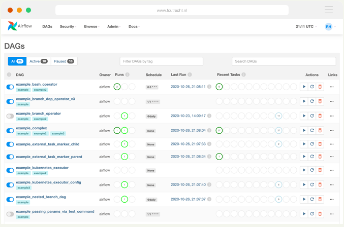 Airflow’s Webserver is a UI that allows to monitor and debug DAGs and Tasks. Here’s Airflow’s UI where we can manage DAGs, Tasks, schedules and runs.