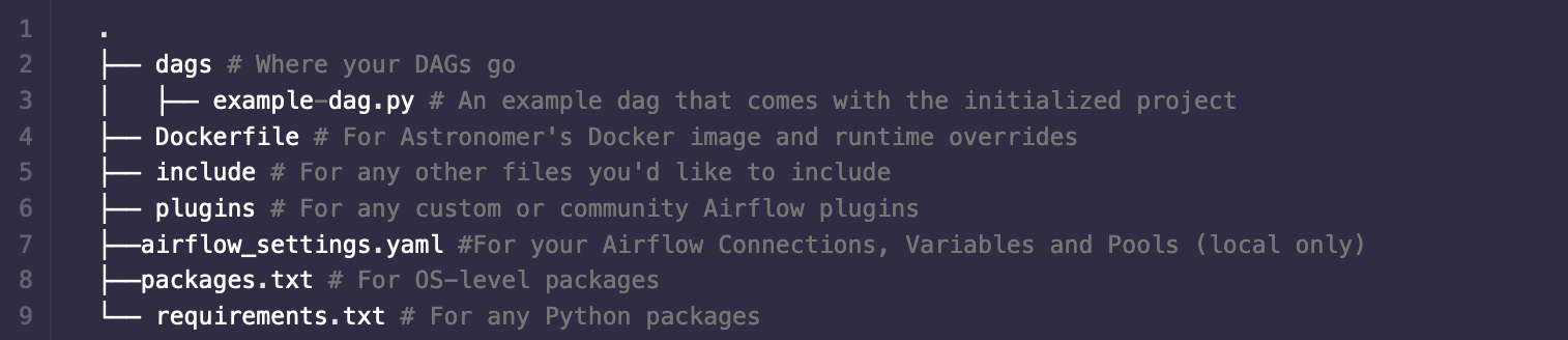 astro dev initThis will create all the directories and files needed by Astronomer in your directory. Then you can put all your dags, includes, and plugins in their respective directories.