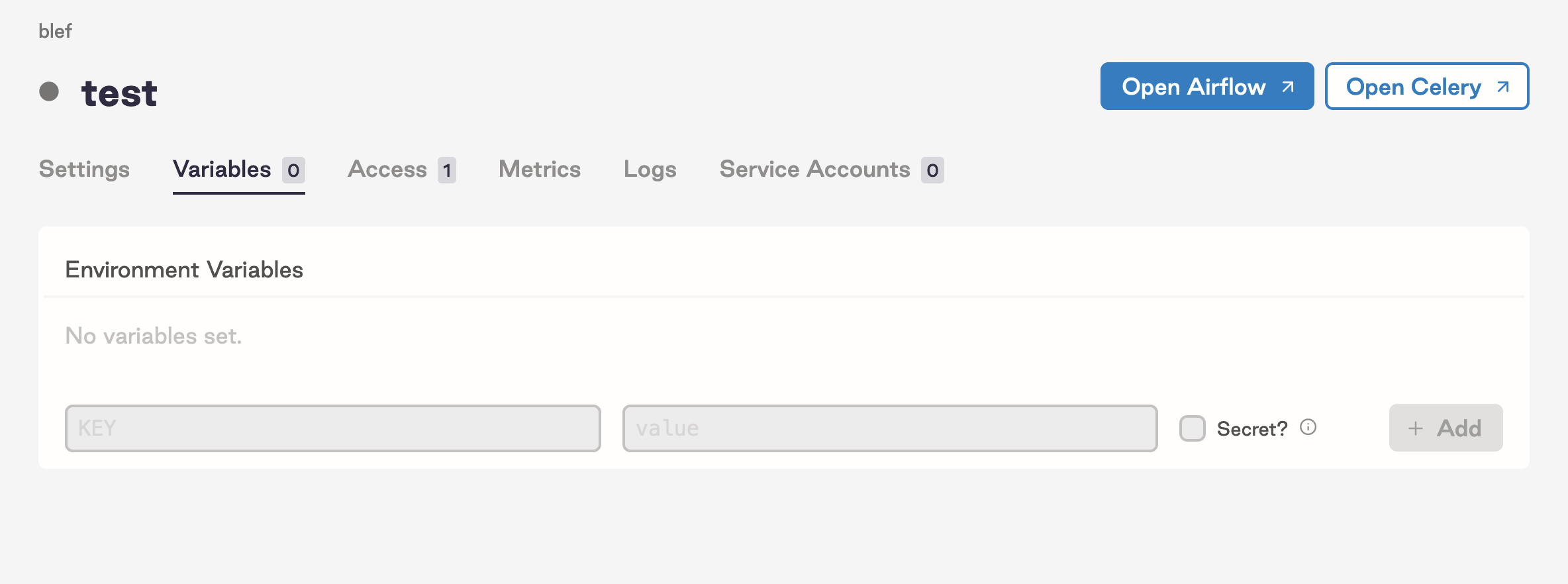 If you have environment variables for your project, you can set them locally in a .env file, or in the Dockerfile generated by the initialization command you run earlier. For secret variables, setting them up in Astronomer’s UI is recommended.