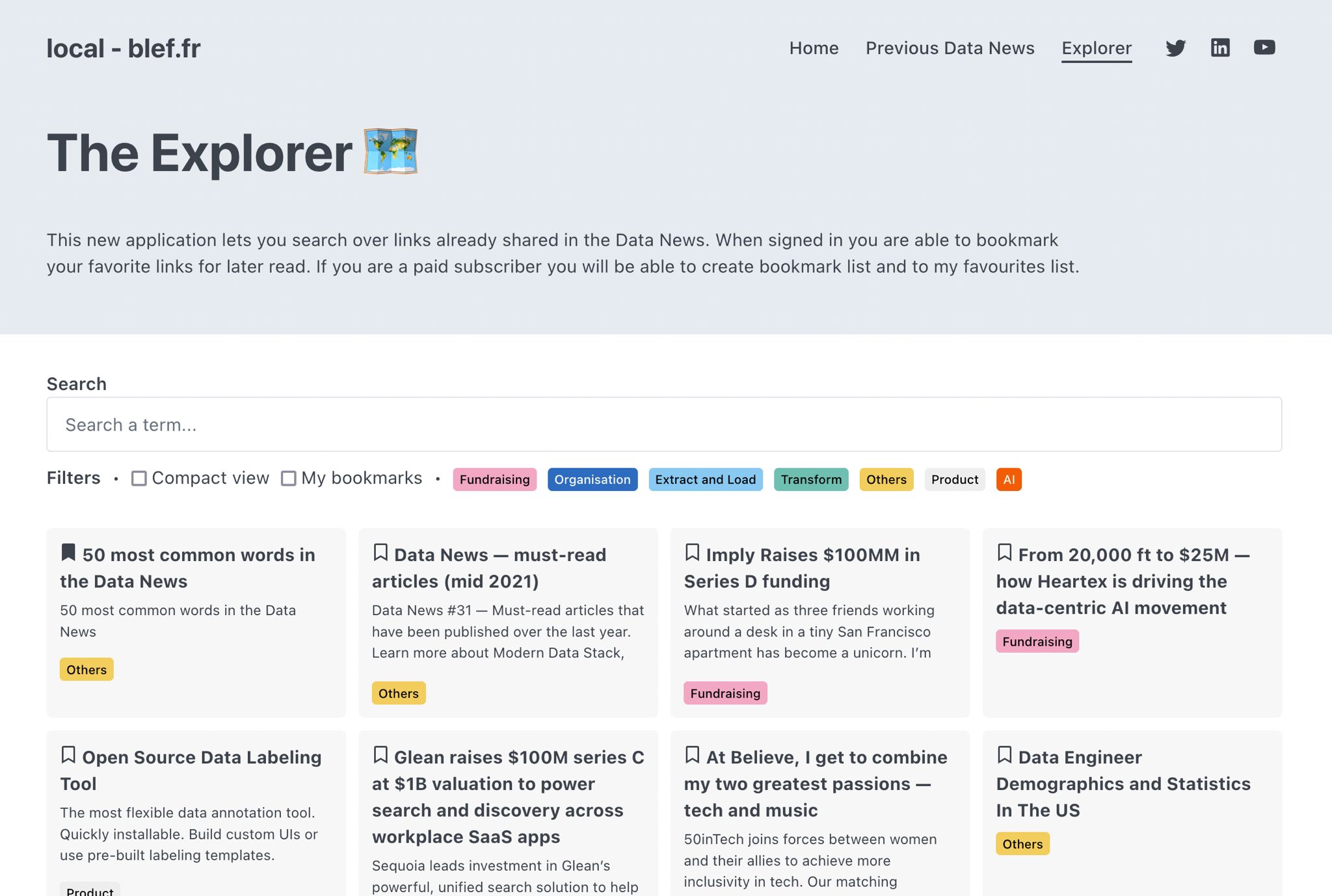 This week I have also release the the Data Explorer private api. The Explorer will be your hub to search over more than 1000+ data links I've shared in the Data News. With bookmarking, full text search and recommendations. Ping me, I'll give you beta access. Right now I just need to finish the content categorisation.