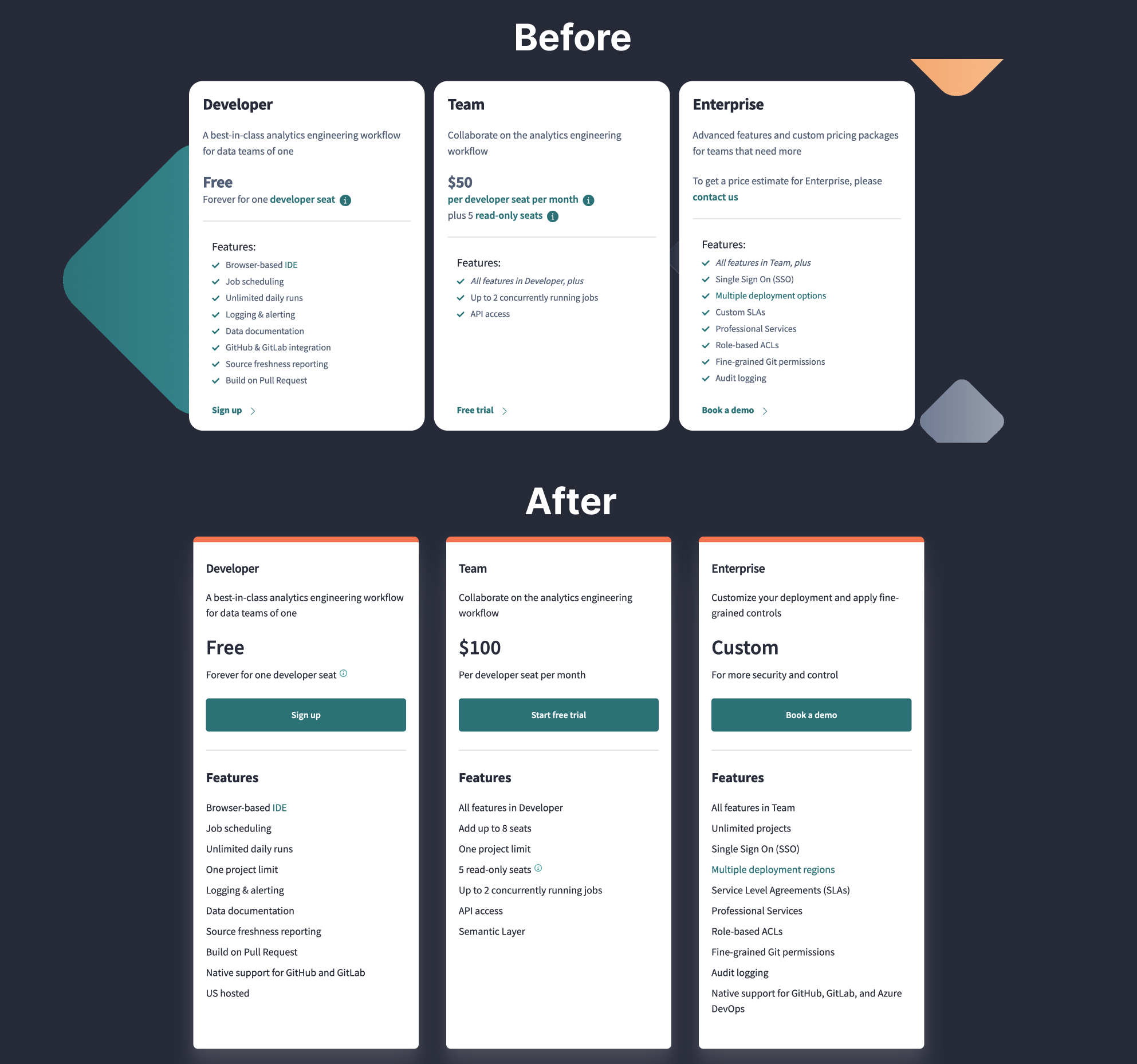In term of strategy it also means that dbt Labs want to push companies to go for Enterprise plan with hidden pricing—don't forget transparency always wins this is one of dbt Labs core value.