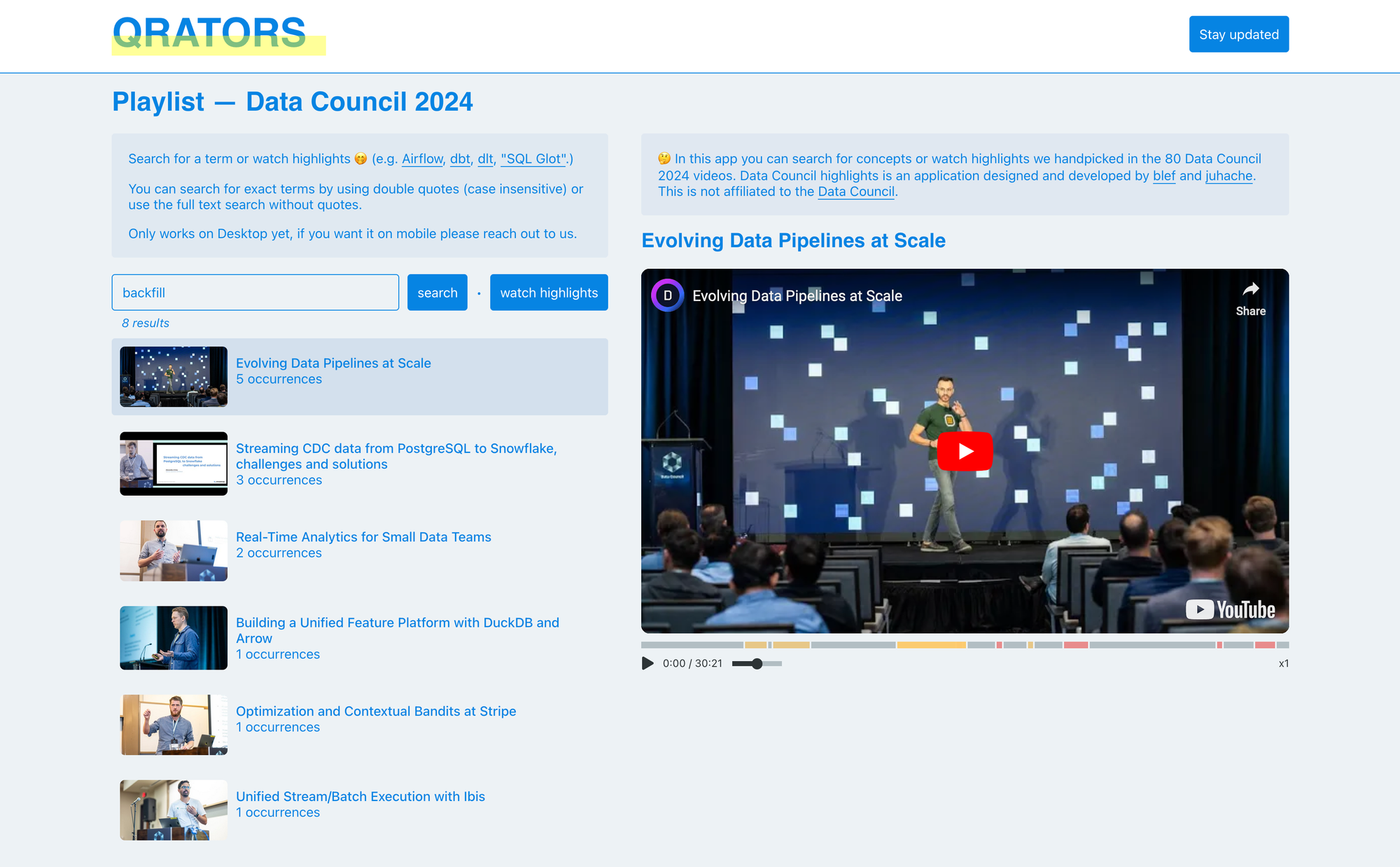 So I developed an app which allows you to search for words in the Data Council video playlist and we've curated highlights with Julien in order for you to watch only what we've curated.