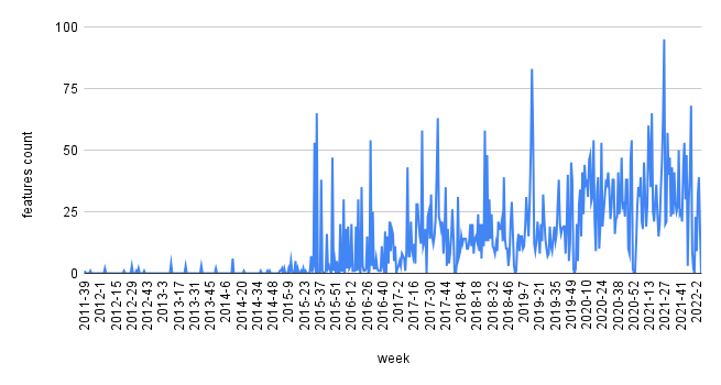 By curiosity I had a look at BigQuery releases pace — below — and it continued to increase since 2015 so even with departures Google is still present, phew.